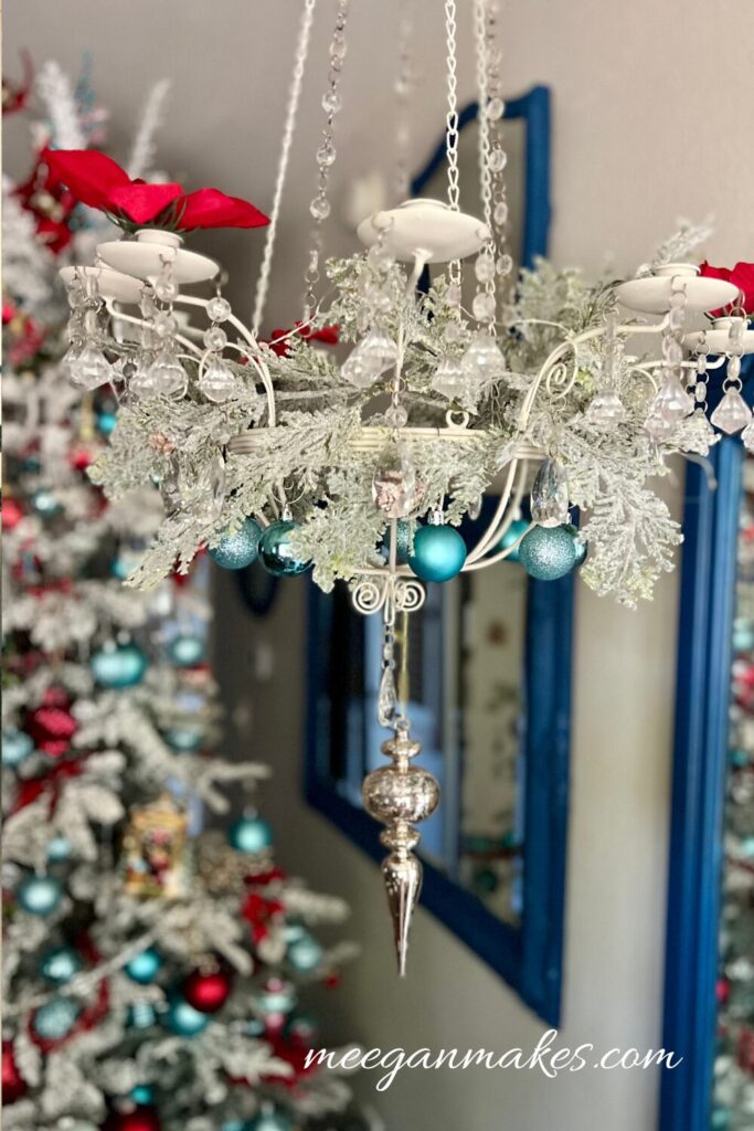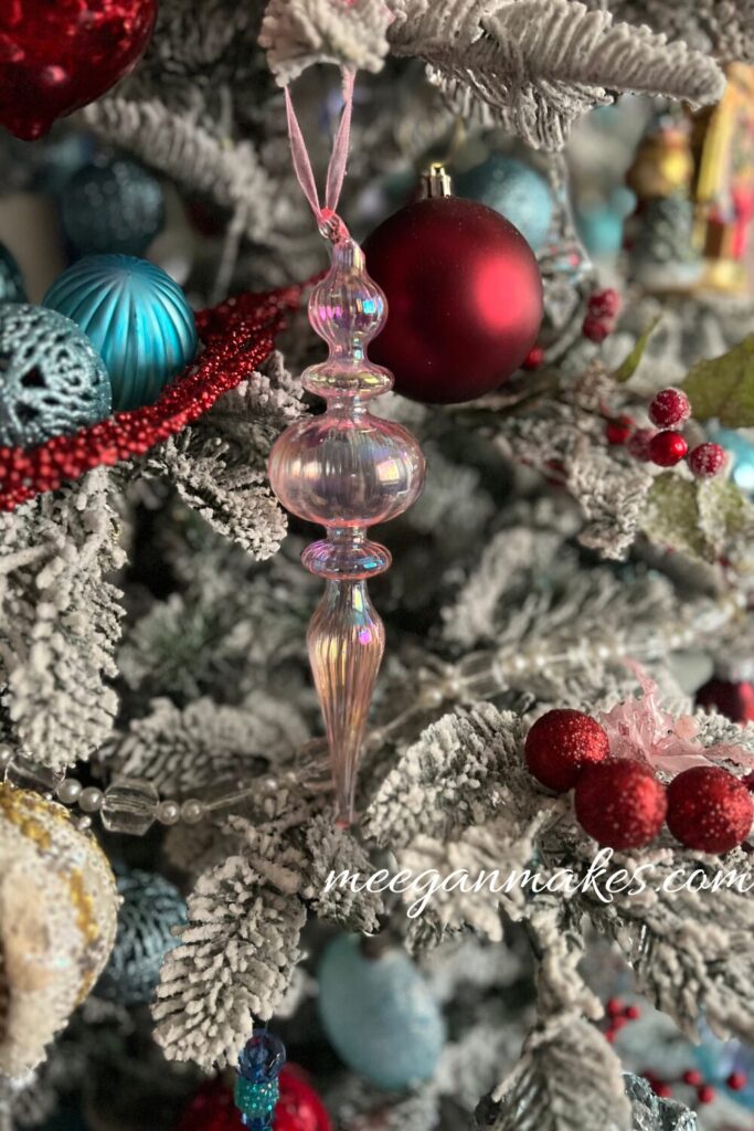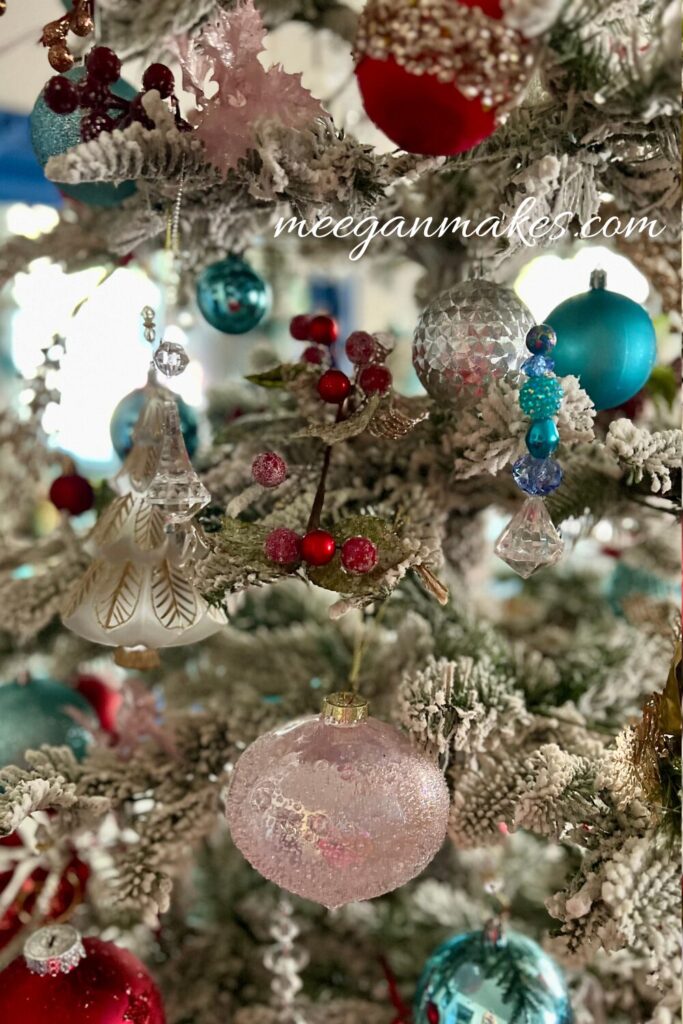 I love how the thrift store aqua ornaments blend well with the higher priced red and pink ones. You would never guess that the aqua ornaments are thrifted finds.