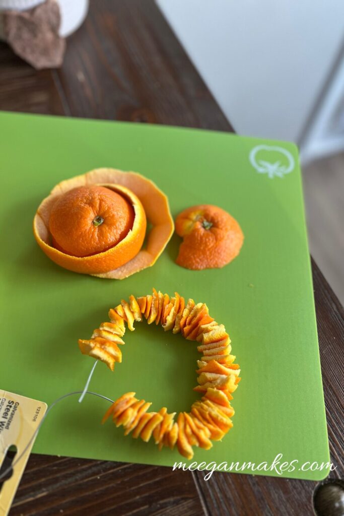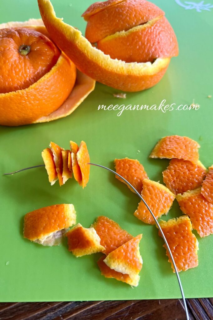 Tear or cut the peeling into 1 inch pieces-or to the size of your preference. Then carefully slide each peel slice onto the wire.