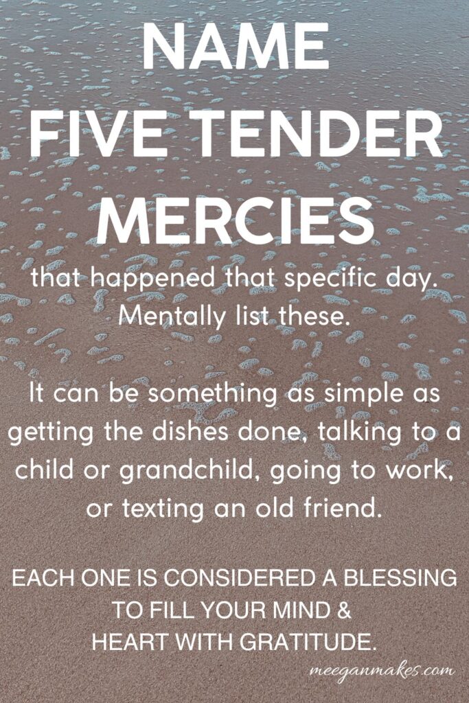 As you are tucked in bed, name five tender mercies that you have experienced on that particular day. As mentioned above it could a simple as an unexpected text from a loved one or being able to get laundry done. It could also be something a lot larger, such as being protected from being in a car accident, finding out great news at a doctor appointment. Whatever YOU see as a tender mercy works.
