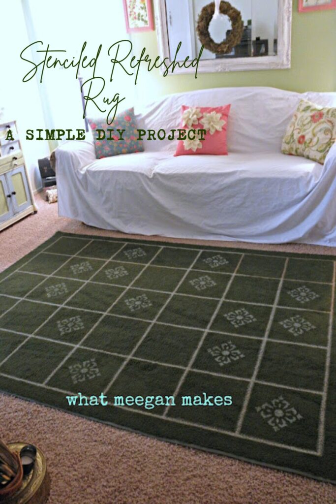 I have had rugs on my mind. I would like 2 new ones for the kitchen, one for the side of my bed, and a new one for the TV room. I look, and look, and look, and look everywhere! I look for deals, I look for colors, and I look for makeovers ideas. I look around even when I don’t need a rug. So, I decided to make my own Stenciled, Refreshed Rug.