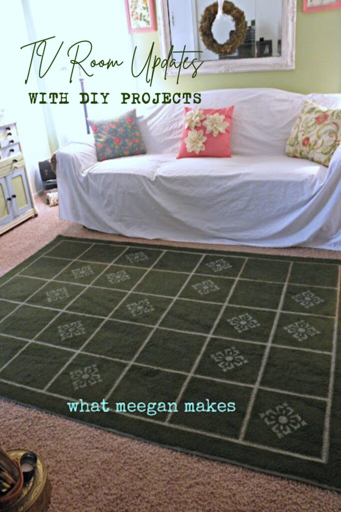 I painted and stenciled my old rug to refresh it up.  It fits so well in the room now, don’t you think?  Don’t mind my make shift slip cover.  I am working on one soon.  I can’t wait!