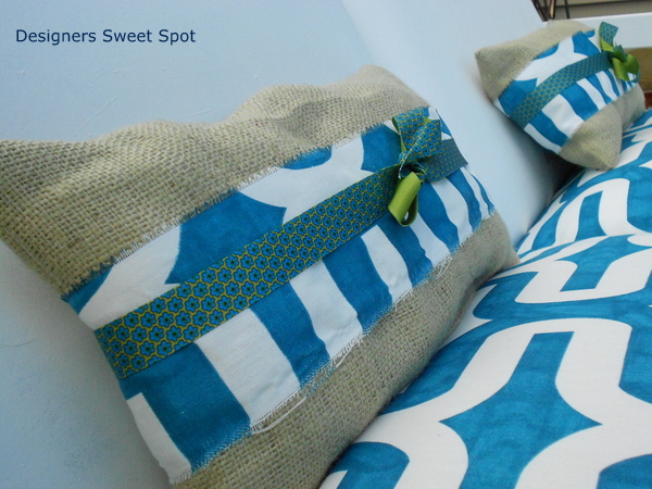 To make the burlap pillows, I reused my holiday pillows and covered them with scraps of the blue print and a bit of ribbon. I didn't even sew them, they are tied and pinned in place.